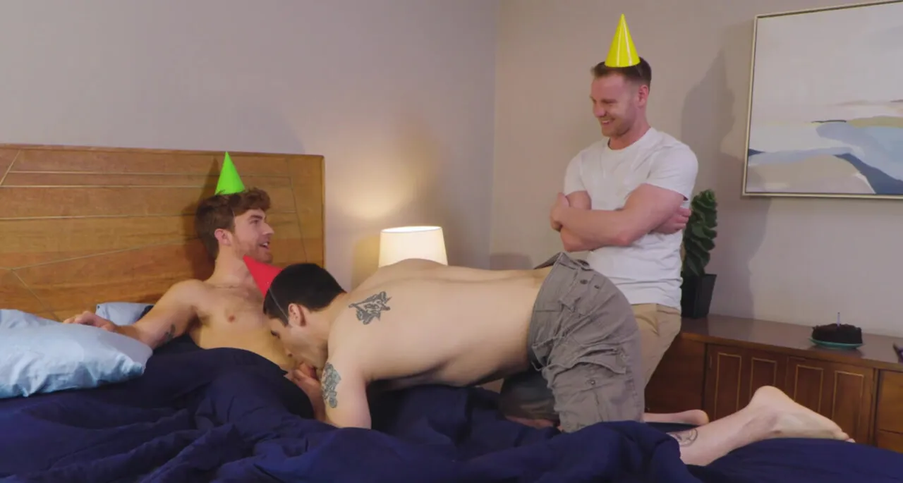 Gay lovers try unique anal perversions in a hot threesome, fucking and blowing each other in all sorts of positions before trying the couch for mutual doggy style sex until the sperm begins to pop on their asses.