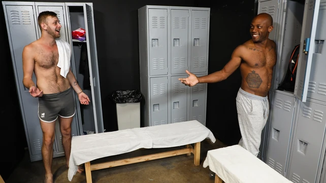 Muscular locker room interracial between Osiris Blade and Chandler Scott