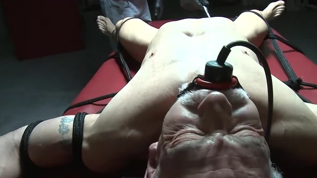 Pouring wax on the body of the tied, tattooed fella