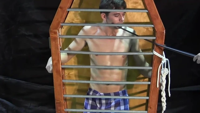 Hot male stands in ropes, fully restrained and ready for his anal punishment
