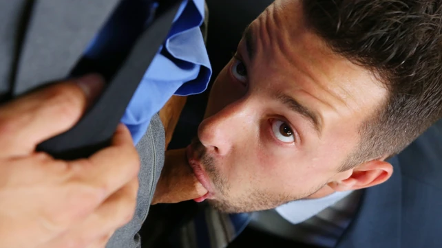 Doominant man plays with a businessman at the glory hole