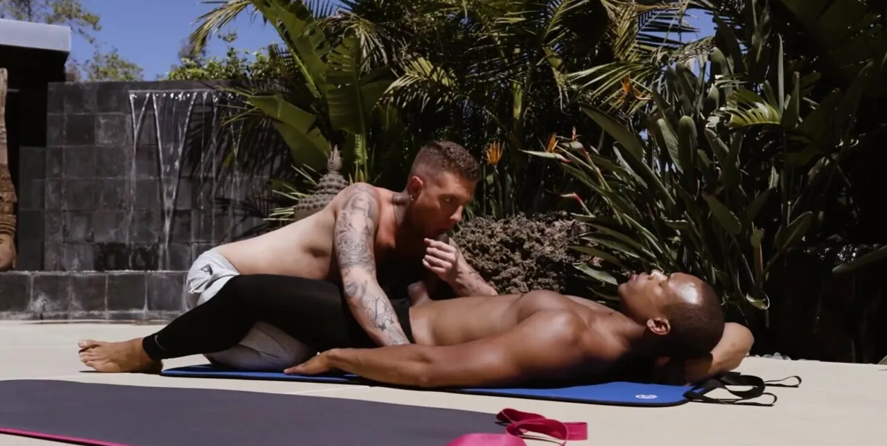 Black stud begins to feel sexually attracted to his white yoga traner, a flexible man with perfect forms and a huge dick, a man whose great anal desires match the black dude's dirty fantasies.